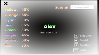 Goal: โ Survive as long as possible while collecting color fragments. โ Each fragment fills your color progression (20 fragments = 100%). โ Hit an obstacle = lose 25% of ALL colors instantly. โ Reach 0% color after collecting at least one fragment = Game Over.