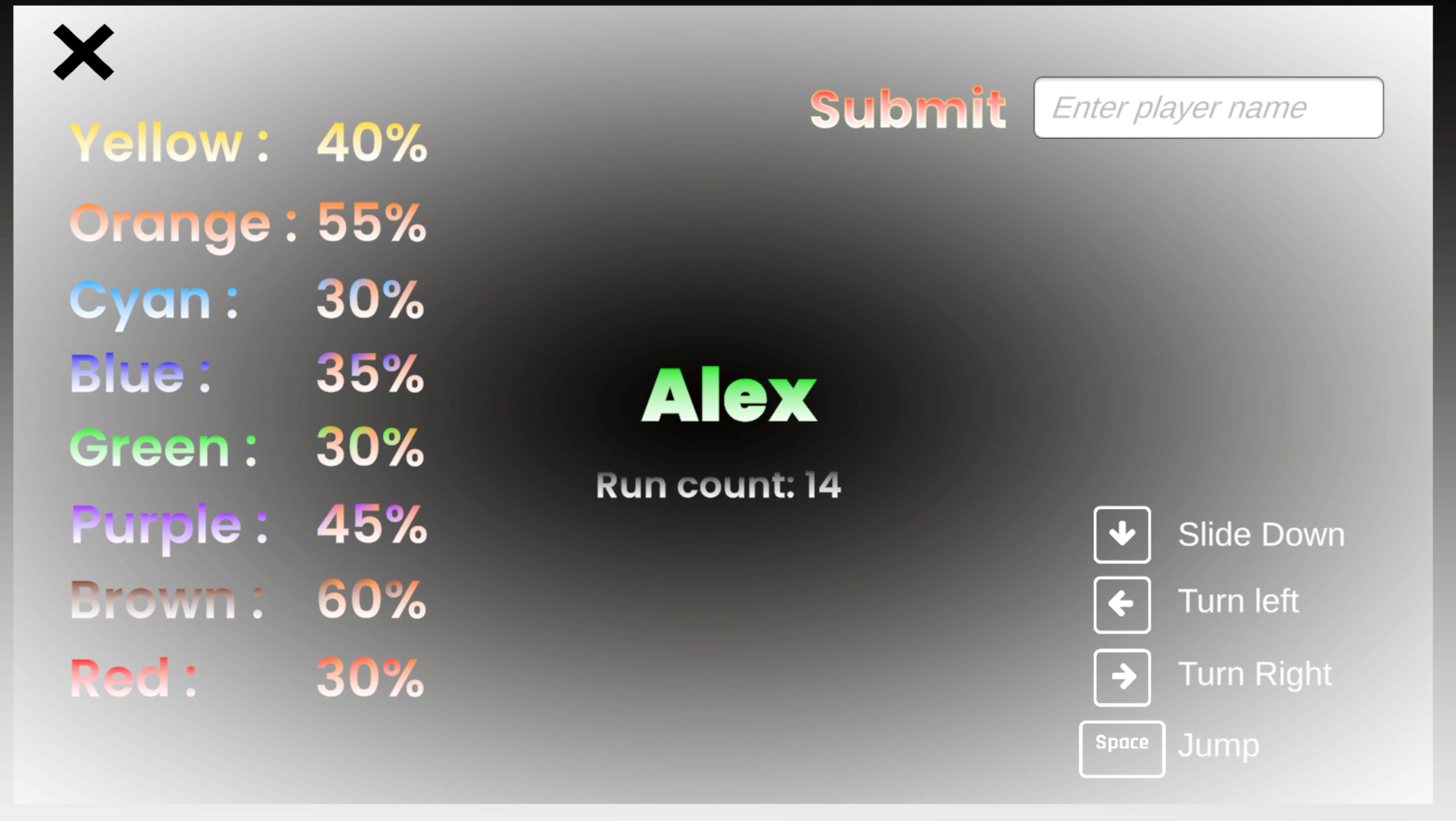 - Player name input with run counter.